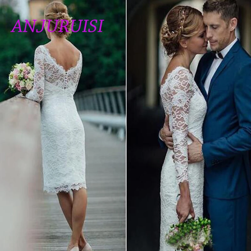 Anjuruisi 2019 Scoop Short Wedding Dress Knee Length Simple Sheath Wedding Gowns Long Sleeves Vintage Lace Bridal Gowns Buttons Wedding Dresses Aliexpress