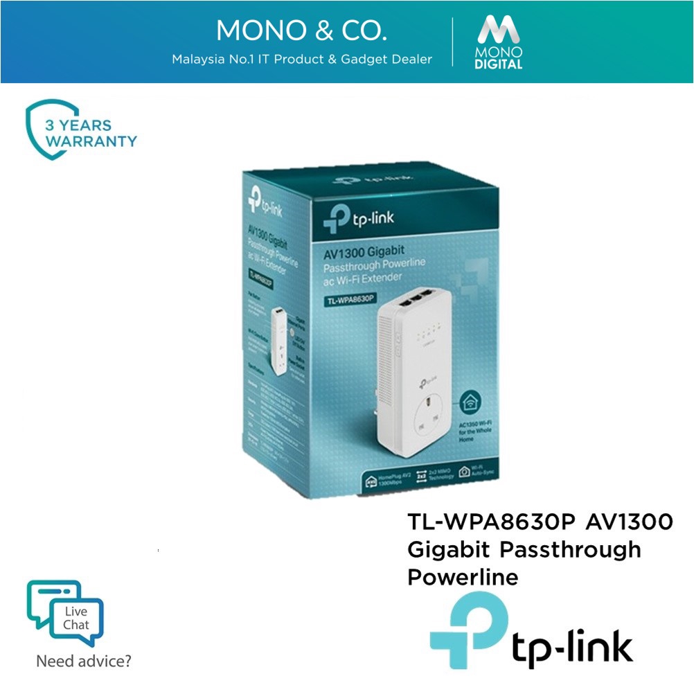 Tp Link Tl Wpa8630p Av1300 3 Port Gigabit Passtrough Powerline Dual Band Wifi Extender With 2x2 Mimo Wifi Clone Button Shopee Malaysia